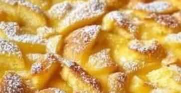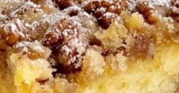 It looks like a soft apple crumb cake (Szarlotka / Apple Streusel Cake) with powdered sugar and a buttery crumble…