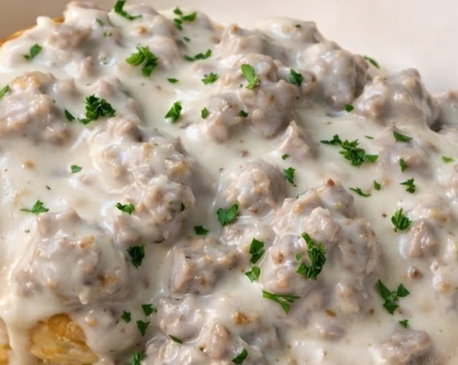Split the warm biscuits in half and place them on a plate similar to your photo. Generously spoon the thick sausage gravy over the top, allowing it to cascade down the sides. Sprinkle with fresh parsley if desired and serve immediately.