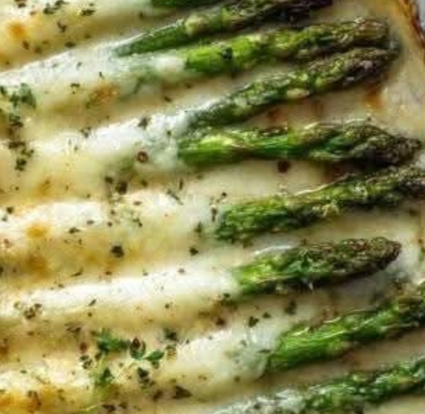 Heat the oven to 400 degrees. – Wash and trim the asparagus, then grease a 9 x 13 baking tray and place them in it. In a skillet, melt the butter over medium heat, then add the soft cheese, heavy whipping cream, chicken broth, garlic powder, paprika, Italian seasoning, salt, and pepper. Stirring constantly until ingredients are well blended.