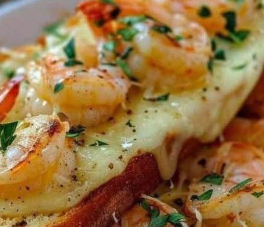 On one half of the garlic bread, layer the cooked shrimp and sprinkle with Monterey Jack cheese.