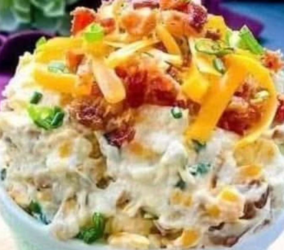 - Add the shredded cheddar cheese, bacon bits, and green onions. Stir until evenly distributed.