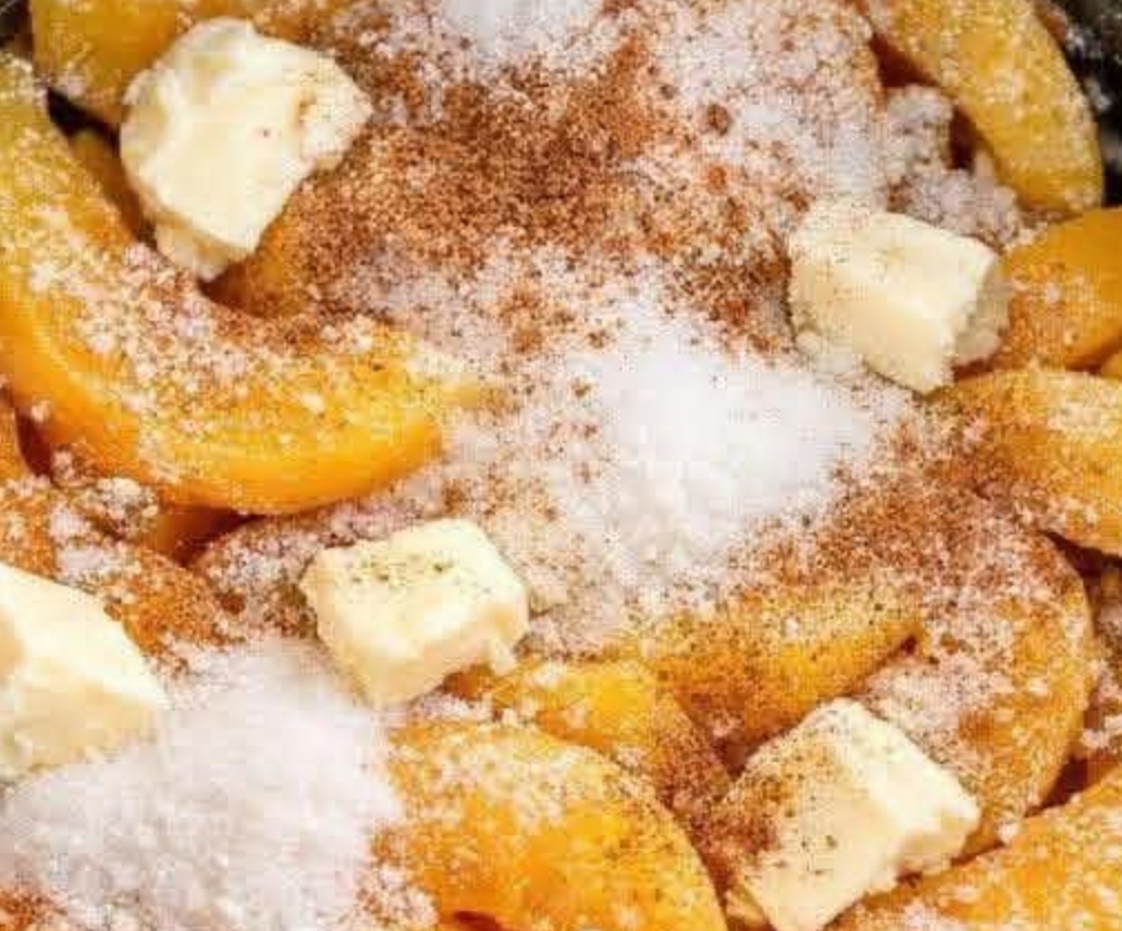 Sprinkle the dry yellow cake mix evenly over the peaches. Try to cover all the fruit, but don’t stir—this is what gives that classic dump cake texture.