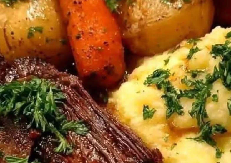 Add Vegetables and Meat: Place the potatoes and carrots in the pot or slow cooker. Lay the seared meat on top.
